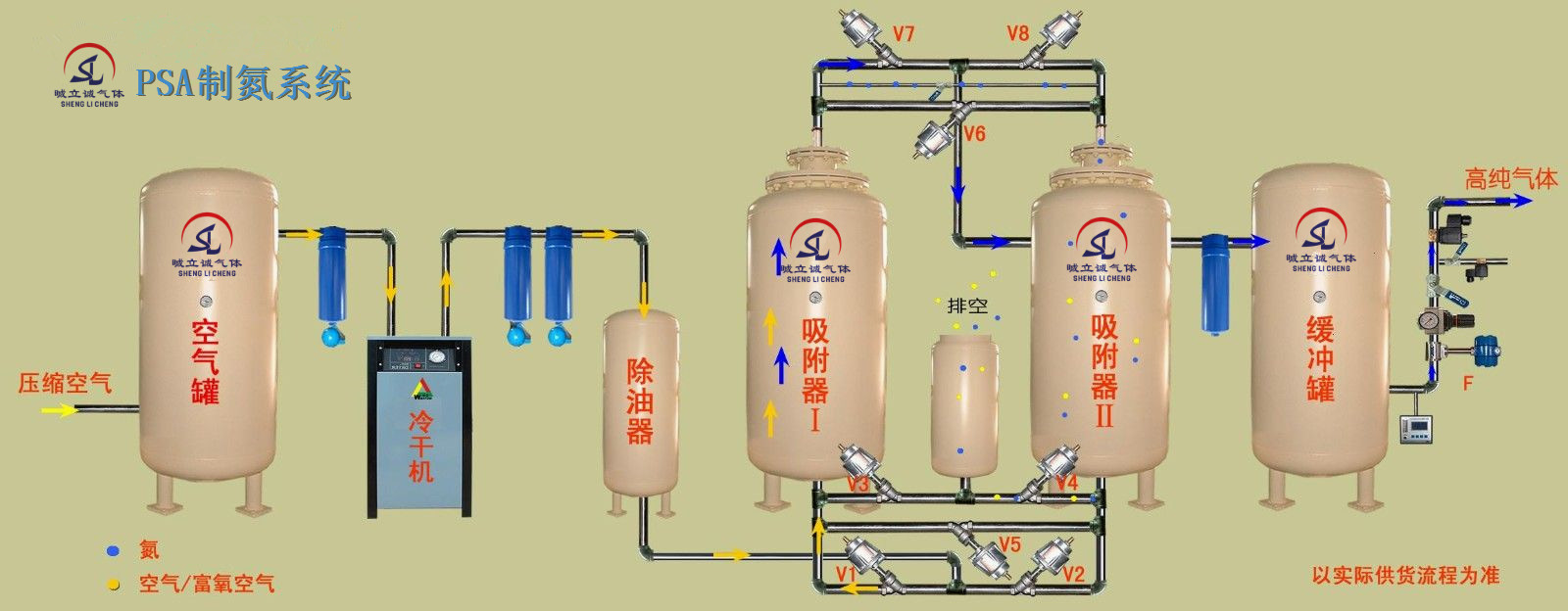 制氮机是按变压吸附技术设计、制造的氮气设备。制氮机以优质进口碳分子筛(CMS)为吸附剂,采用常温下变压吸附原理(PSA)分离空气制取高纯度的氮气。通常使用两吸附塔并联,由进口PLC控制进口气动阀自动运行。
